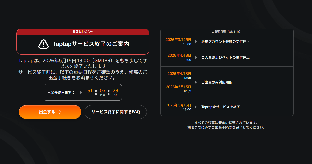 オンラインカジノ「Taptap」は、2026年5月15日 13:00(GMT+9) をもって、すべてのサービスを終了することが発表されました。