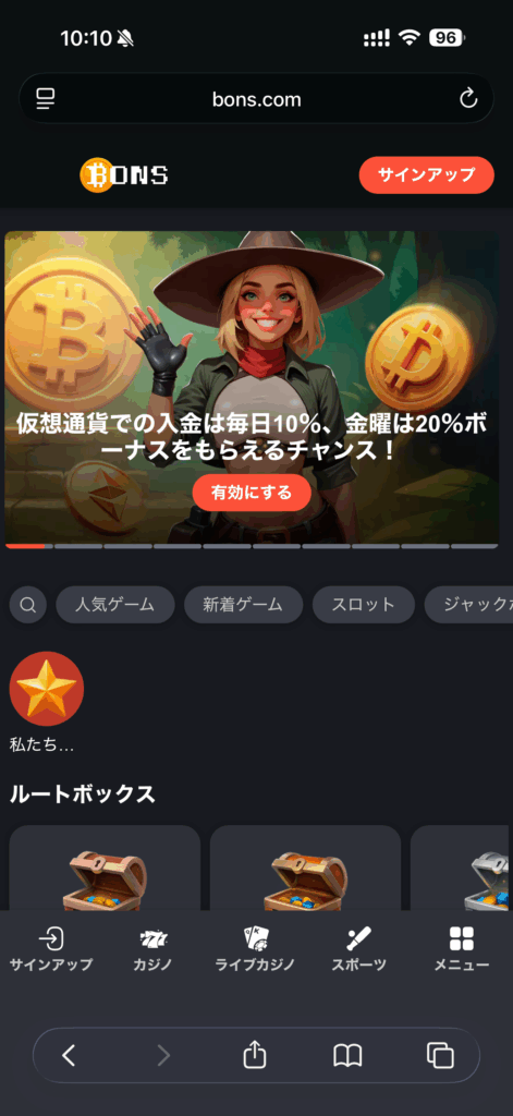 • 本人確認(KYC)不要: 仮想通貨での利用なら、個人情報の提出なしでプレイ&出金が可能。プライバシー重視の方に最適。