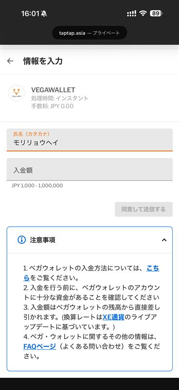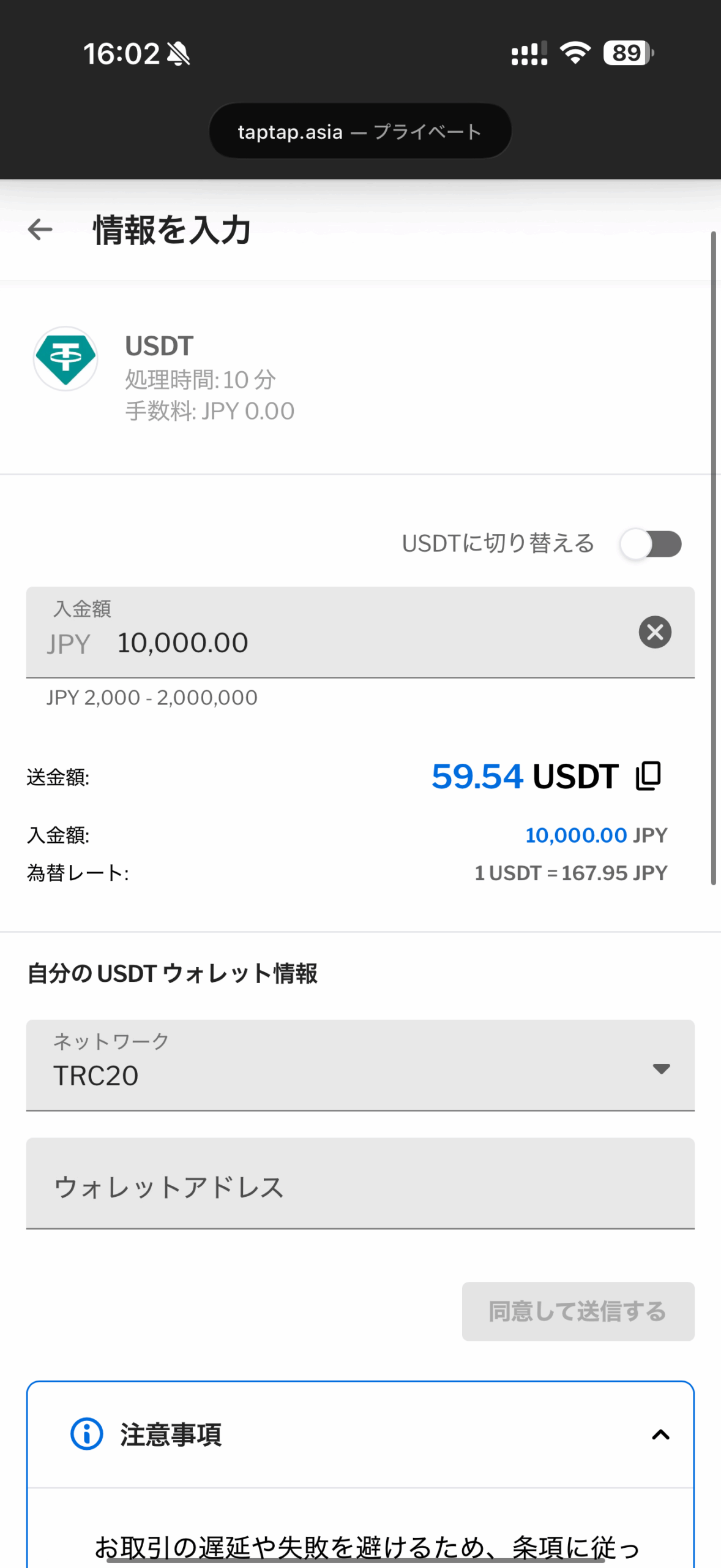 - 入金金額: 希望する額を入力(例:10,000JPY)